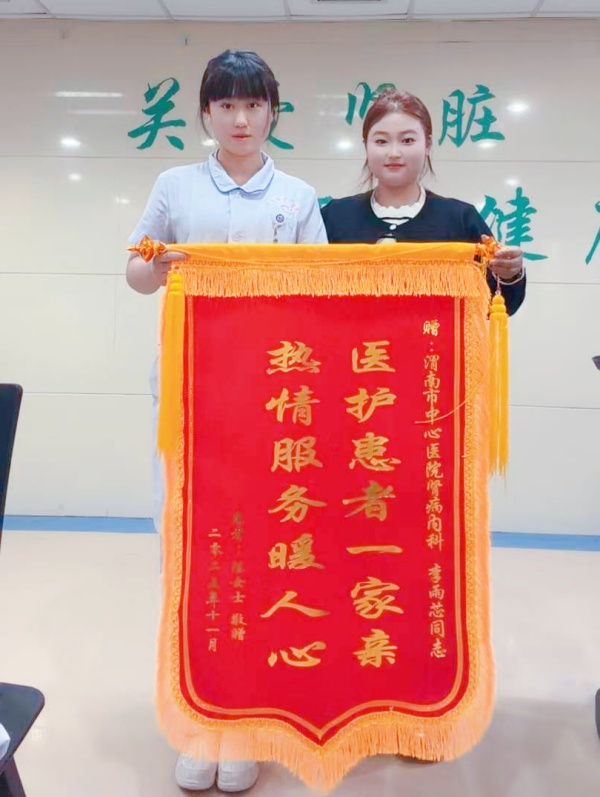 一线聚焦陕西渭南电(副总编:张家南 张思彤)近日,有患者家属给渭南市中心医院肾病内科的护士李雨芯同志送去了一枚锦旗,据了解,该患者在渭南市中心医院肾病内科住院20余天,责任护士是李雨芯。