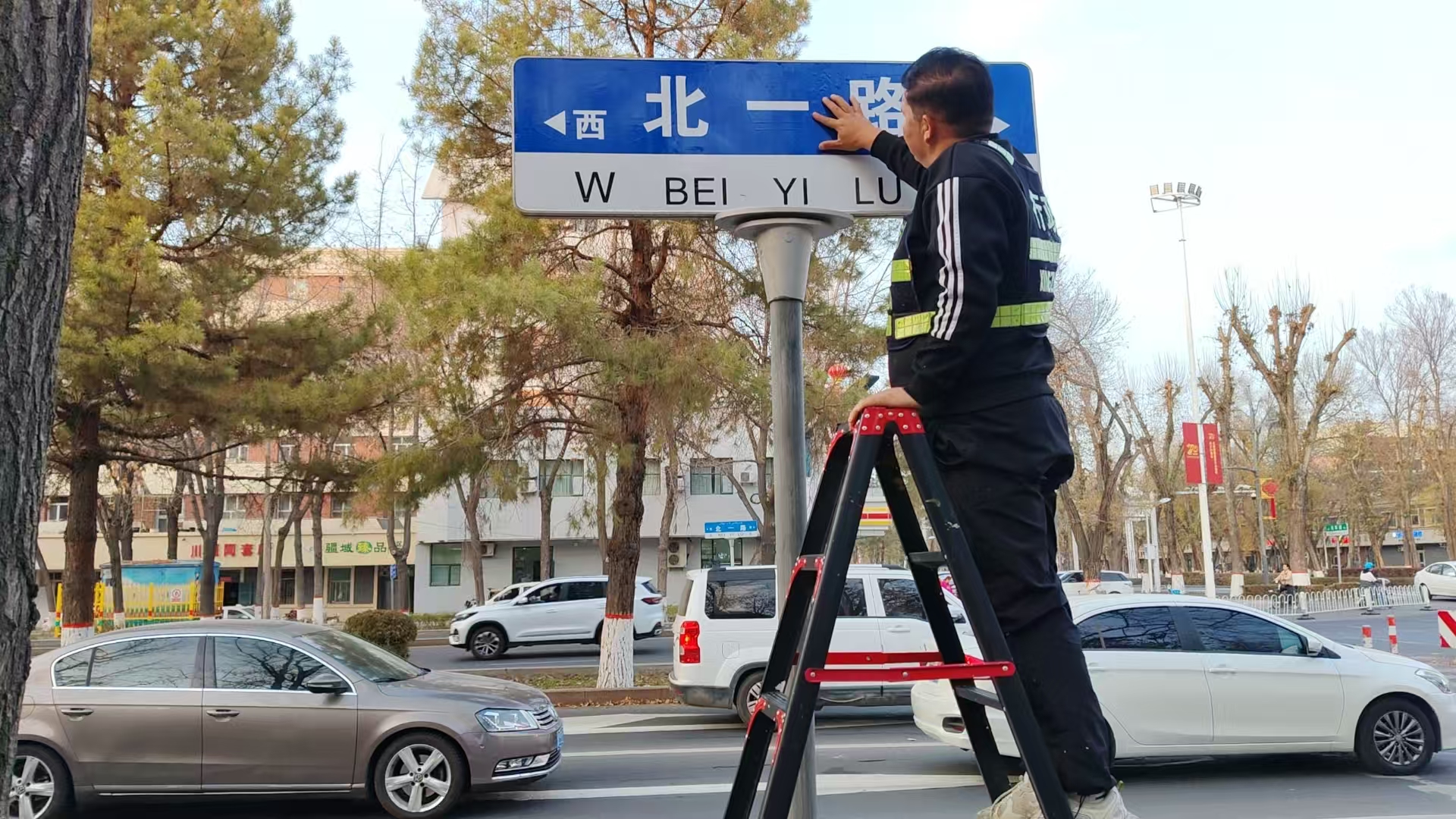 在工作现场,市政工人们细致地清理旧有标识,将崭新、清晰、符合国家通用语言文字规范的新贴纸精准粘贴在路名牌的指定位置。新更换的指示贴纸以国家通用语言文字为基本用字,字体工整,信息准确,色彩醒目,极大地提升了标识的辨识度与指引功能,方便了市民及游客的出行。