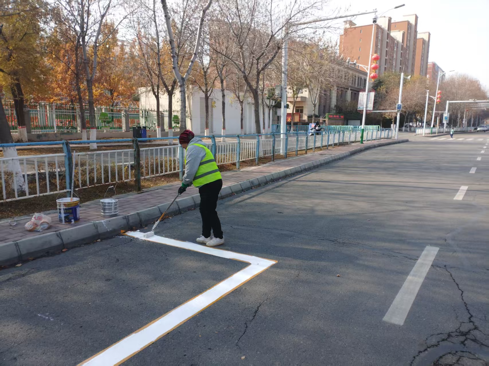 为解决这一问题,石河子市城管局市政工程养护中心对上述交通压力较大的学校周边道路进行了全面摸排。针对标线缺失、淡化的问题,市政工人利用专业设备,对原有停车位进行了细致地补划和重新施划。如今,在学校门口及周边路段,一条条崭新、醒目的白色停车线清晰可见,如同一个个“规范框”,明确指引着停车区域。