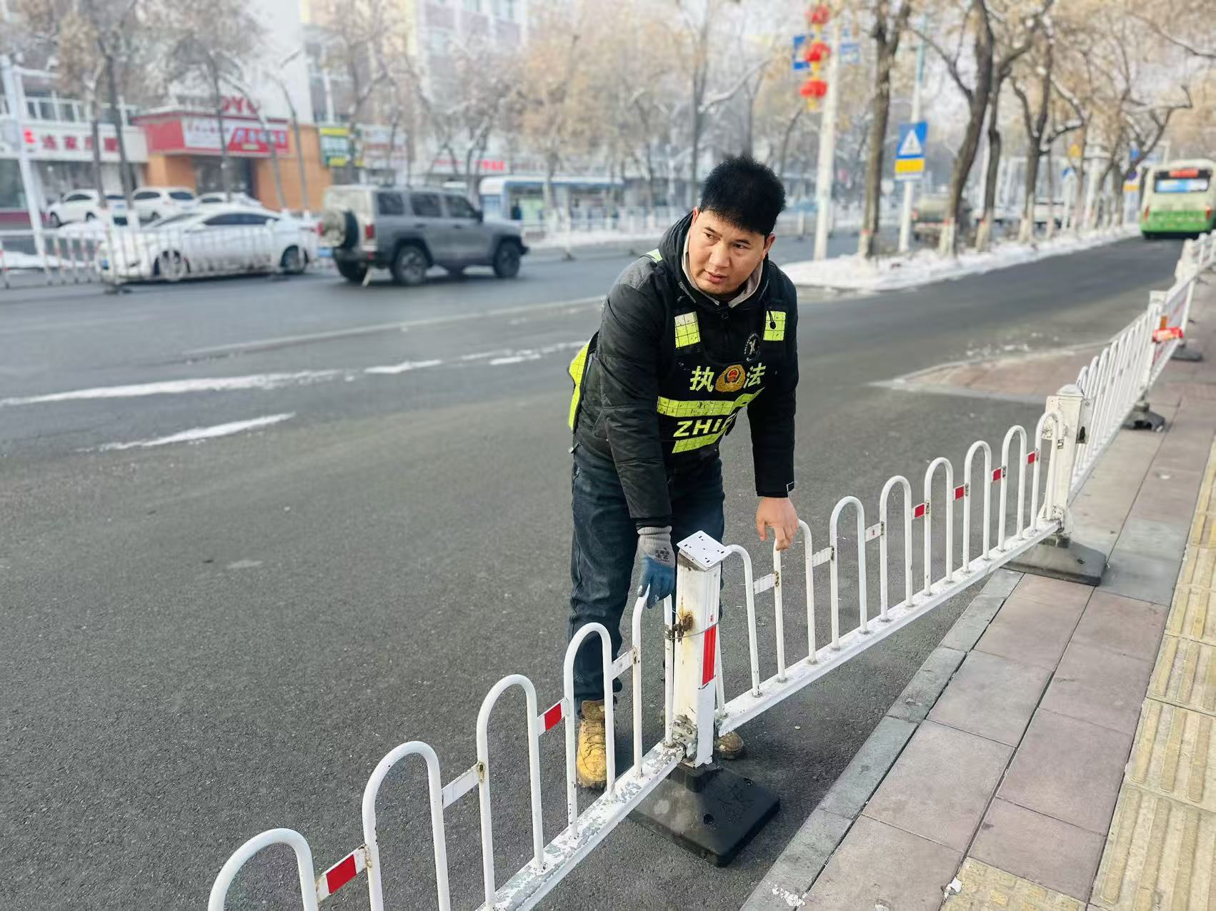 在北四路维修现场,一组人员正在更换被车辆撞损的护栏片;另一组在东环路检查并紧固因温度变化产生松动的连接部件。尽管气温极低,工人们操作熟练有序,短短半小时内就完成三处损坏点的修复工作。