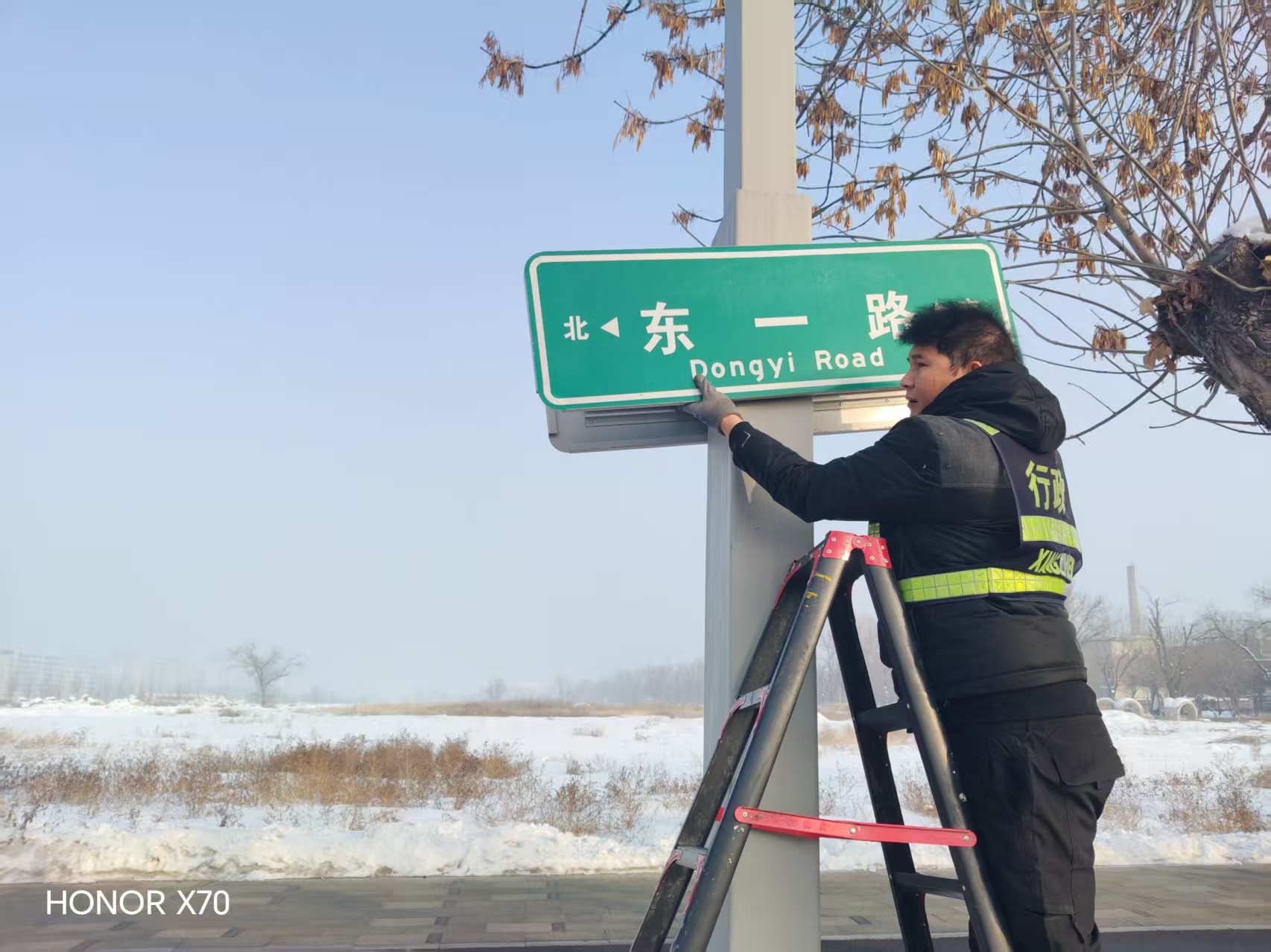 2月6日一早,在石河子市东一路的维护现场,市政工程养护中心的交通设施维护人员已开始对道路上出现歪斜的一块路名牌进行精准的维修与校正。扶正杆件、紧固螺丝、校准方向……一系列熟练的操作后,路名牌恢复了应有的端正与醒目。这只是该中心节前维护工作的一个缩影。