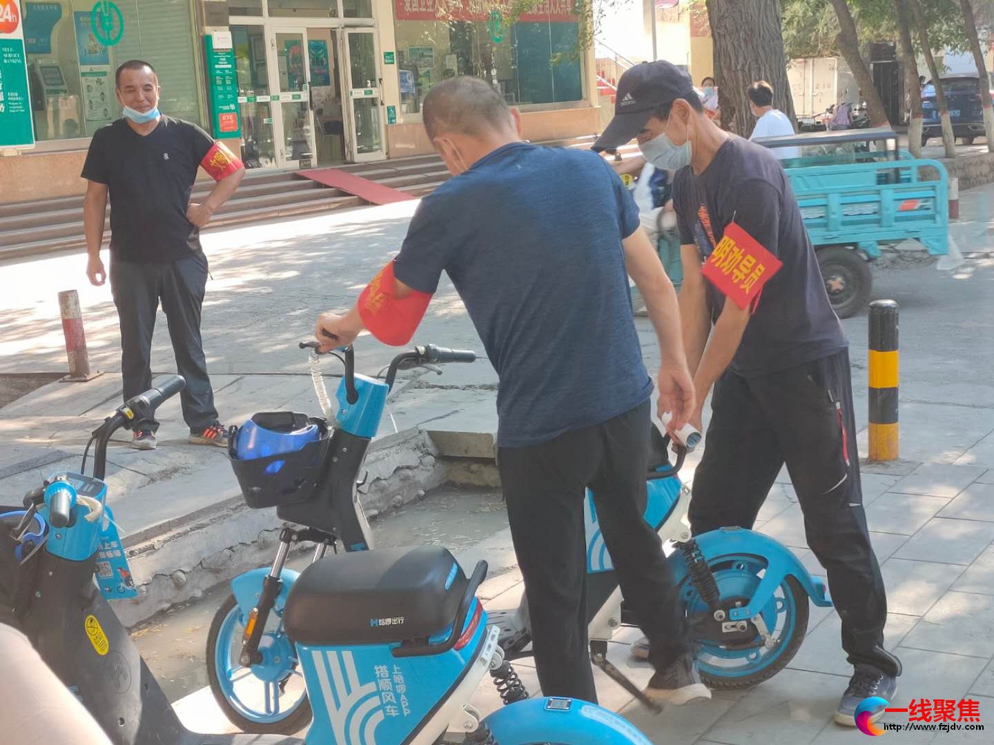 8月3日,在北二路康乐市场前,城管局市政工程养护中心的3名文明劝导员正在对未按规定停放的非机动车辆进行有序停放。