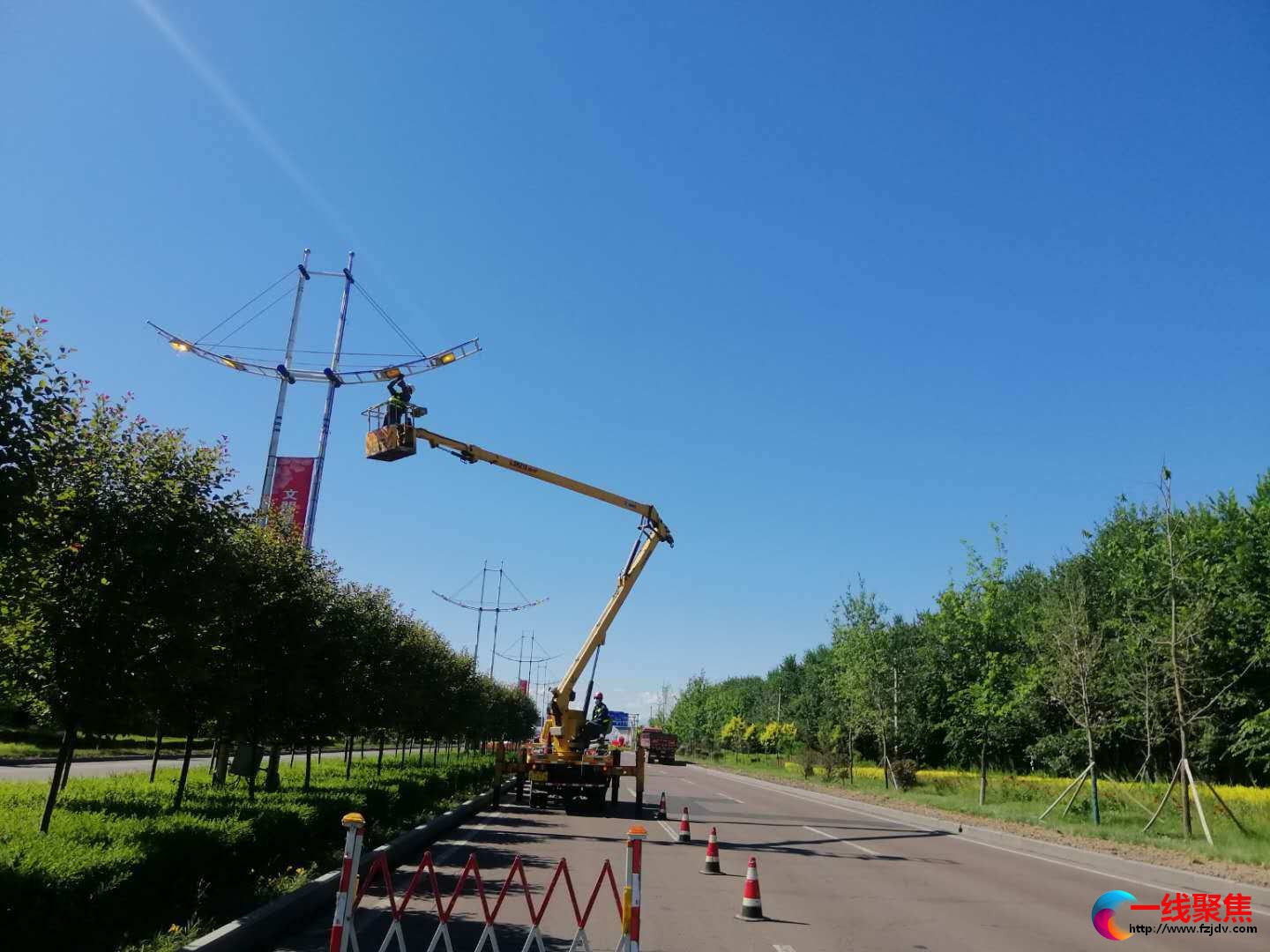 9月18日早上,在我市双拥路上,一台市政路灯维修作业车高高升起,周围摆放着施工提示牌、拉起安全网,检修人员正在对该路段的路灯进行排查和更换损坏的路灯。