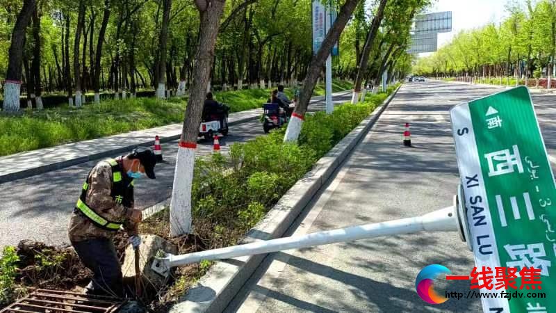 5月3日,在西三路(北三路至北四路段),石河子市城管局市政工程养护中心的交通设施维护人员正在对一处倾斜倒塌的路名牌进行校正修复,在美化城市环境的同时,也提升了道路安全系数。